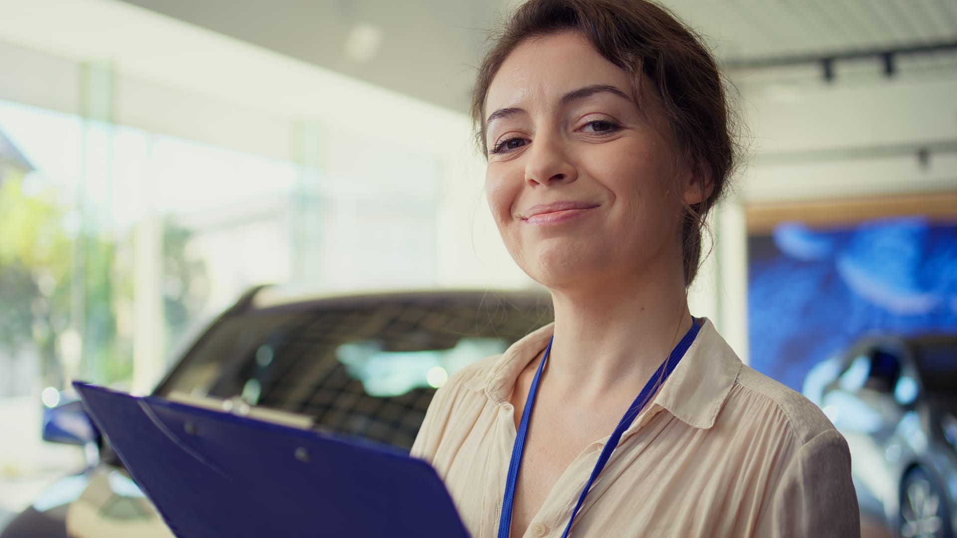 Mujer sonriente con portapapeles en un concesionario de coches, con vehículos desenfocados al fondo.